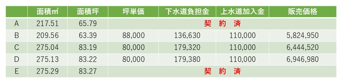 | 備考 | 販売価格に上水道加入金、下水道負担金を含みます。 上下水道引込工事・歩道切り下げ工事後引渡し。 確定測量後、価格に増減あります。 |